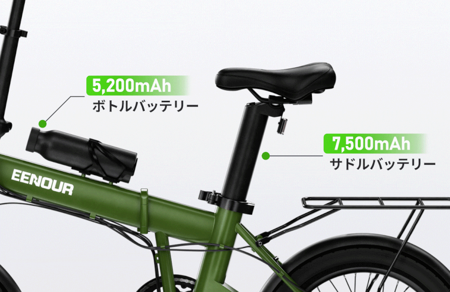 デュアルバッテリーシステムを採用。本体のサドルバッテリーは7,500mAh、オプションのボトル型予備バッテリーは5,200mAhで、併用すると航続距離は最長140km。お出かけ等の長距離移動でもバッテリー切れの心配はありません。