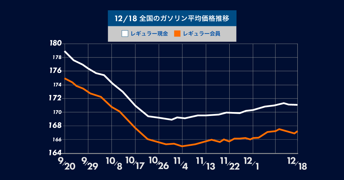12月18日(月) 時点のレギュラーガソリンの全国平均は、171.1円となり先週と変わらず横ばいとなりました。