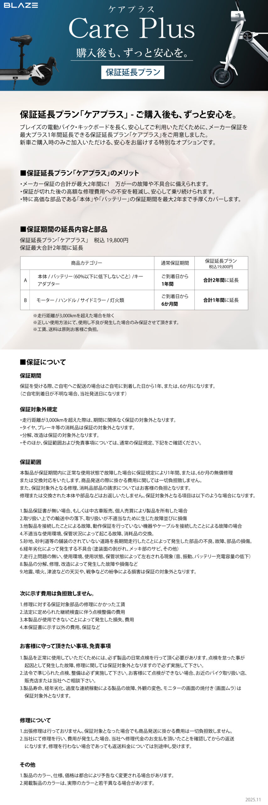 株式会社ブレイズ(愛知県名古屋市、代表取締役:市川秀幸、以下ブレイズ)は、2025年12月10日(水)より、電動バイク・キックボードをご購入いただいたお客様に、より安心して長くご利用いただけるよう、メーカー保証を最大1年間延長できる 保証延長オプション「ケアプラス」 を新たに追加いたしました。